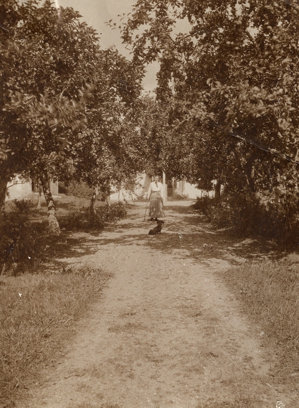Titel: En kvinna och en hund. Bostadshus i bakgrunden. Doktorinnan Maria Norström, född Ekström, och hennes ständigt åtföljande tax Björn. Maria är gift med doktor Robert Norström, Örebro. Hon är dotter till prosten/hovpredikanten Albert Ekström och Sofia "Siffi" Ekström, född Lagerholm. Maria är kusin till Juliana (Julia) Mannerfeldt (född Lagerholm).
