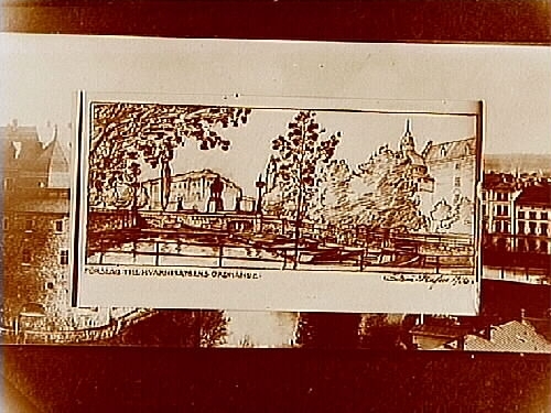 Förslag till kvarnplatsens ordnande. Ryttarstaty och motorbåtshamn.