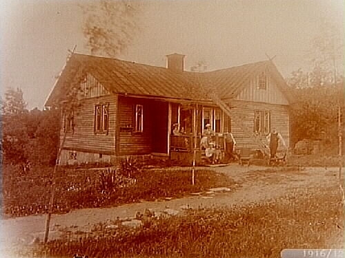 En vånings sommarstuga i nationalromantisk stil, med förstebro. Familjegrupp, sex personer framför huset.