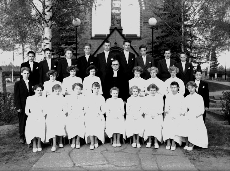 Konfirmander, 15 flickor, 11 pojkar och pastor Karl-Erik Wolf.