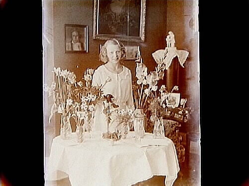 Rumsinteriör, en kvinna vid blomsterbordet.