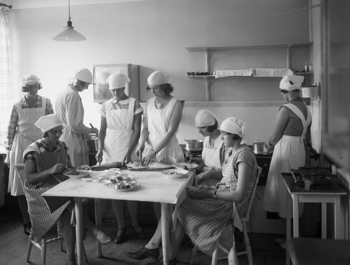 Dövstumsskolan, interiör av skolköket, sju flickor.
