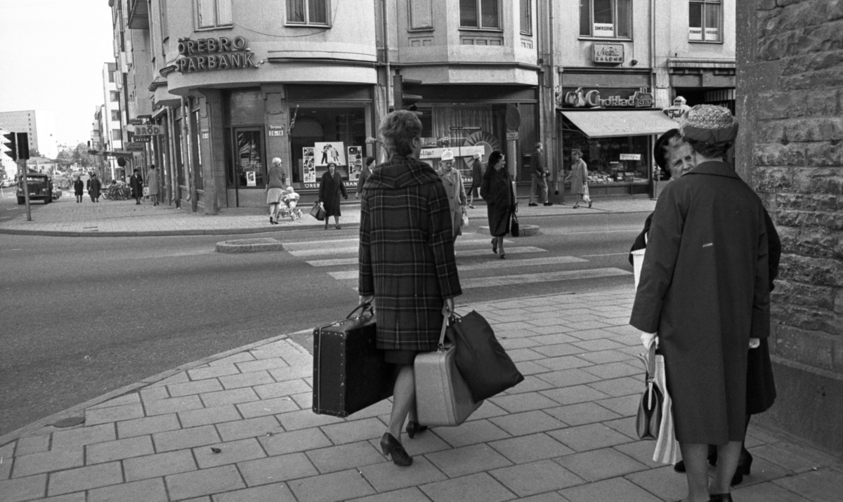 Bildserie: en kvinnlig journalist med flera resväskor testar hjälpsamheten hos medmänniskorna. Här är hon på väg från järnvägsstationen upp på Storgatan. På bytiksskyltarna står bland annat Bröd, Choklad och Speceriaffär.