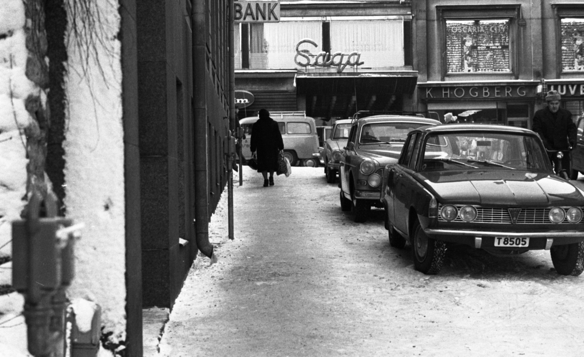 Till höger syns en bil av märket Rover parkerad samt en Volvo amazon bakom den samt därefter ytterligare en bil. Till höger i bild kommer en man cyklande. Bakom honom på andra sidan gatan ligger en affär med namnet "K. Högberg." Fler bilar syns även på bilden.