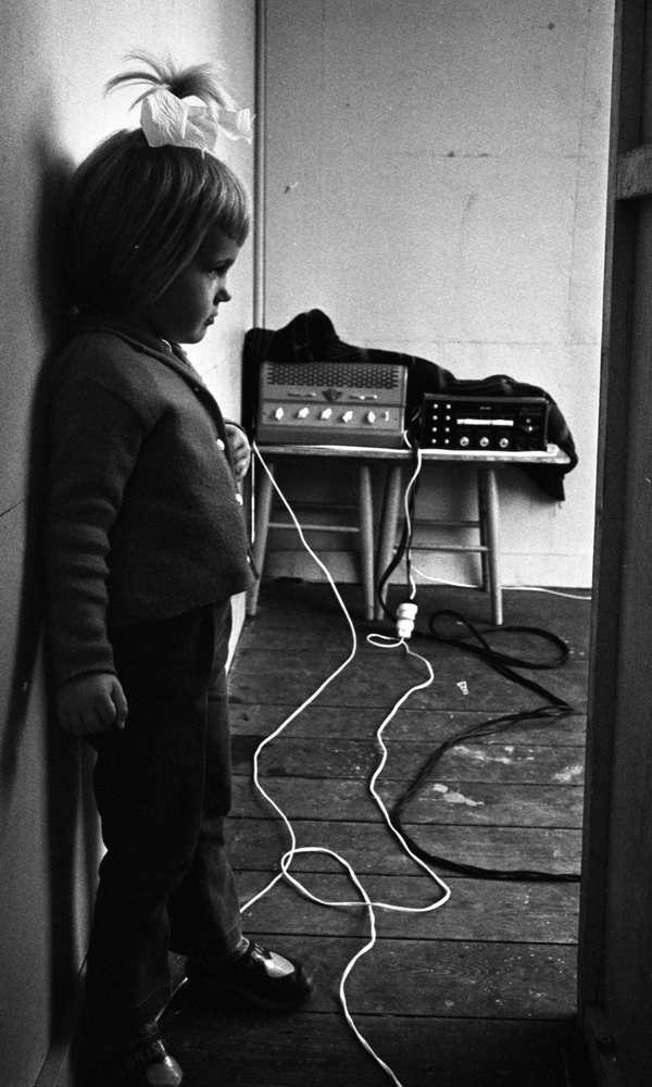 På bilden i förgrunden står en liten flicka med rosett i håret. Hon är klädd i en liten jacka, byxor och skor. Hon står lutad mot väggen bakom kulisserna till en utomhusscen vid Krämaren i Örebro. I bakgrunden står teknisk utrustning med sladdar till lutade mot väggen.