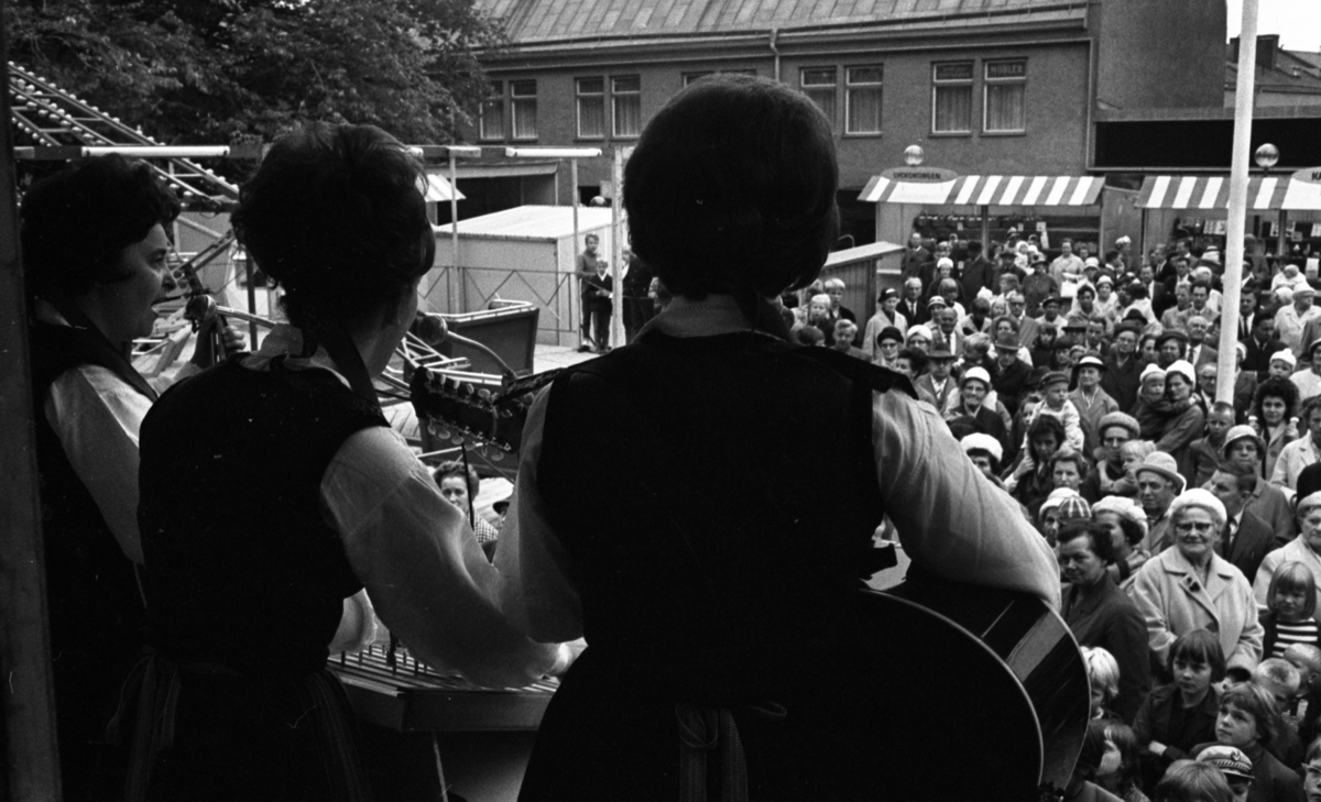 De tre "Göingeflickorna" uppträder på en utomhusscen. De är fotograferade bakifrån. De sjunger. De står på en utomhusscen framför Krämaren i Örebro. Mikrofoner står framför dem. Två av medlemmarna i musikgruppen spelar gitarr. De står på ömse sidor om kvinnan i mitten av gruppen som spelar cittra. Nedanför scenen står en stor publik och blickar upp mot scenen där Göingeflickorna står. Byggnader och affärsbodar syns i bakgrunden."Göingeflickorna" var ett schlagerband som var aktivt 1955 - 1975.