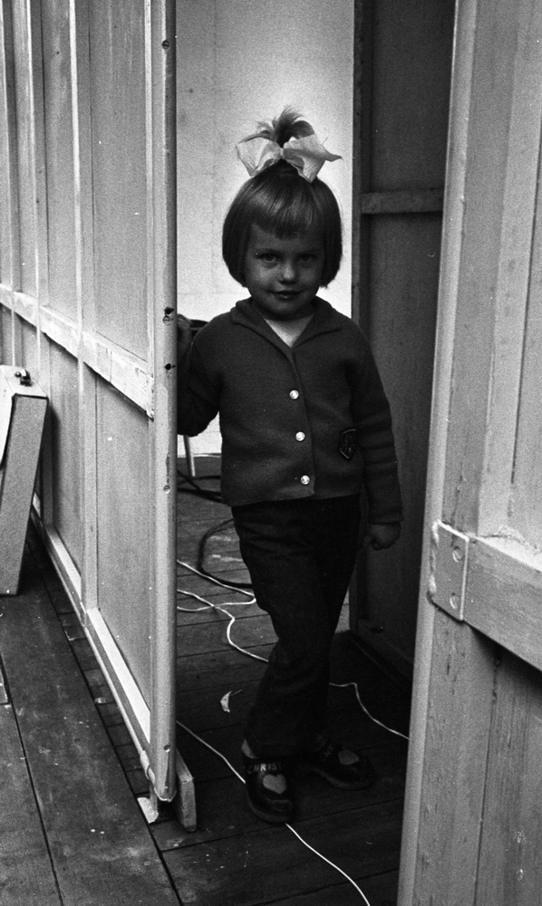 På bilden syns en liten flicka med rosett i håret. Hon är klädd i en liten jacka, byxor samt har skor på fötterna. Hon ler. Hon står bakom kulisserna till en utomhusscen utanför Krämaren i Örebro.