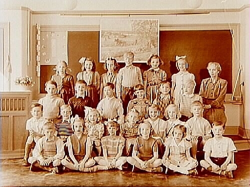 Titel: Engelbrektsskolan, klassrumsinteriör, 25 skolbarn med lärarinna fröken Emmy Söderlund, klass 2ac, sal 5.