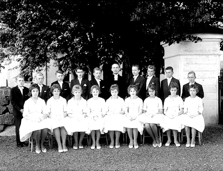 Konfirmander, 9 flickor, 9 pojkar och kyrkoherde Ragnar Wilhelmsson, vikarie för kyrkoherde Gunnar Johansson (som var sjuk).