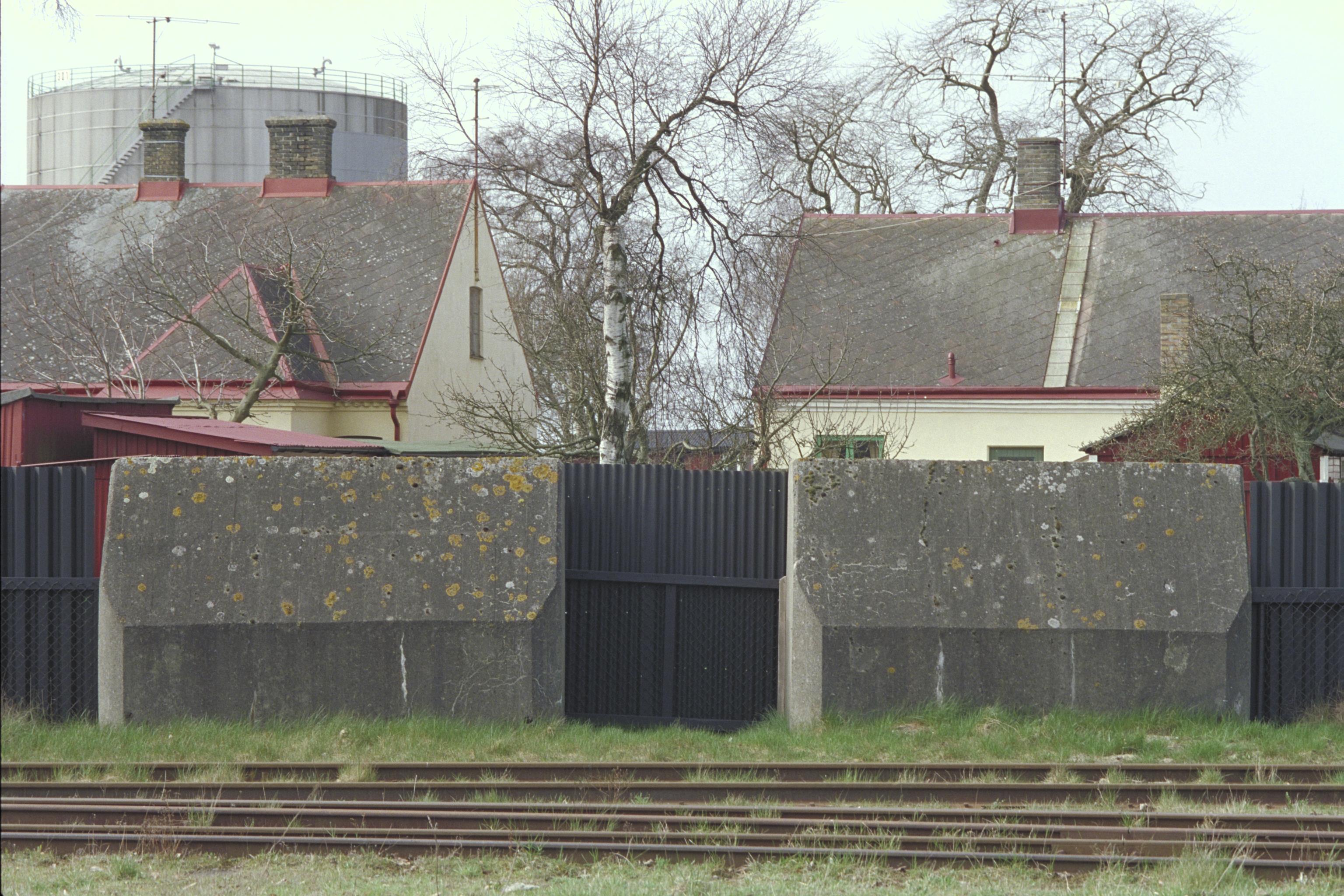 Villatomter vid järnväg med stridsvagnshinder som staket.