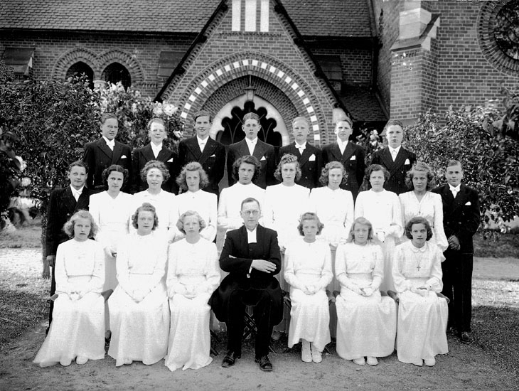 Konfirmander, 14 flickor, 9 pojkar och kyrkoherde Eneström.