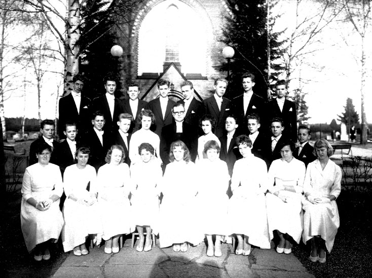 Konfirmander, 11 flickor, 16 pojkar och pastor Karl-Erik Wolf.