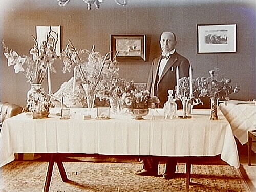 Titel: Rumsinteriör, en man vid bordet, födelsedag. Lokförare A. Persson