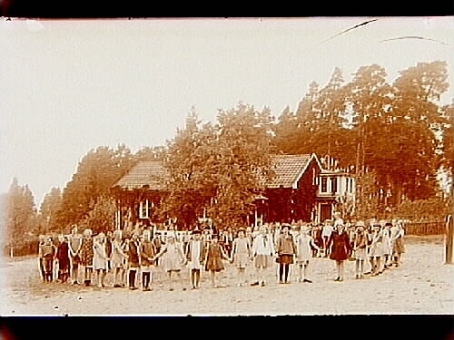 Götlunda skola, envånings skolbyggnad med trapphus, skolbarn framför byggnaden.