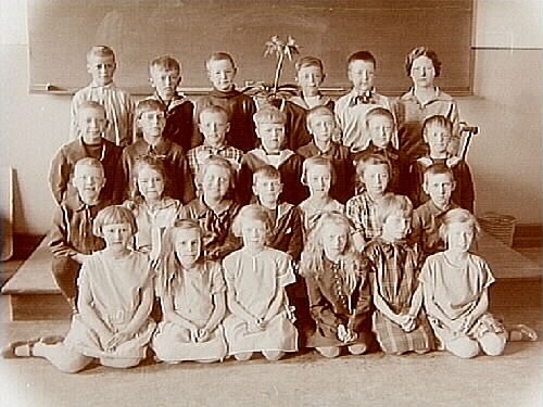 Olaus Petriskolan, klassrumsinteriör, 25 skolbarn med lärarinna fröken Elsa Lindh.
