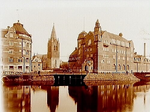 Till höger på bilden syns den gamla träbron, elverkshuset, församlingshuset och Nikolaikyrkan.