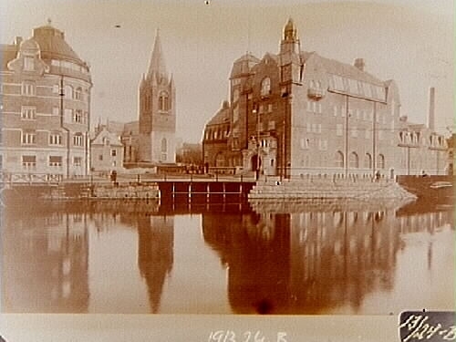 Från vänster på bilden syns den gamla träbron, Elverket, Församlingshuset, Nikolaikyrkan och Telegrafhuset.