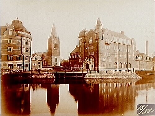 Från vänster på bilden syns den gamla träbron, Elverket, Församlingshuset, Nikolaikyrkan och Telegrafhuset.