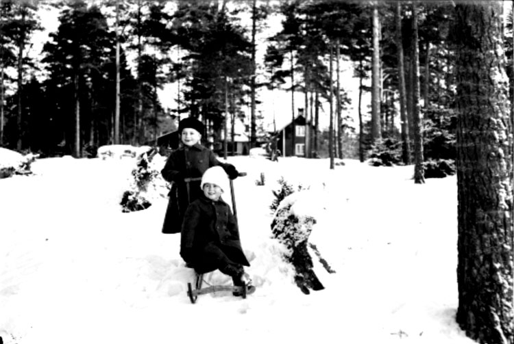 Sven, 5 år och Karl-Erik, 7 år, med sparkstötting.