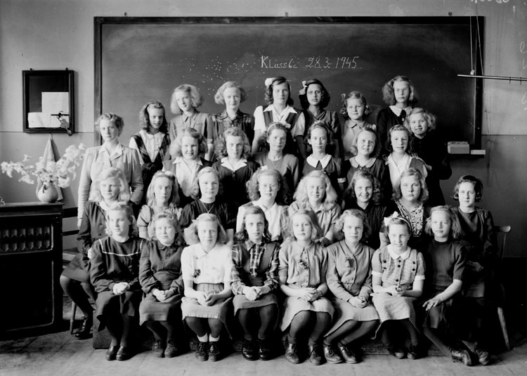 Vasaskolan, klassrumsinteriör, 30 flickor med lärarinna fröken Margit Svensson.
