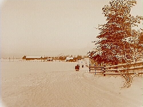Vinterbild, släde och två personer på vägen.