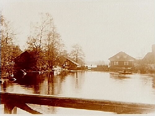Kvarnbyggnad vid Arboga ån, 11 personer på dammbordet. Bostadshus i grönskan.