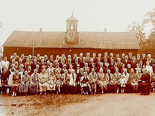 Esplunda Herrgård, envånings byggnad med urtavla och vällingklocka. 86 personer framför byggnaden.