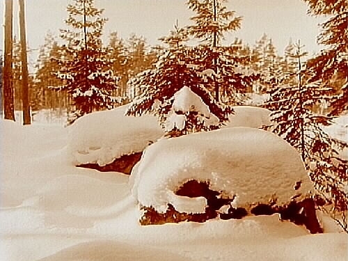 Sörbyskogen, vintermotiv, snötyngda granar.