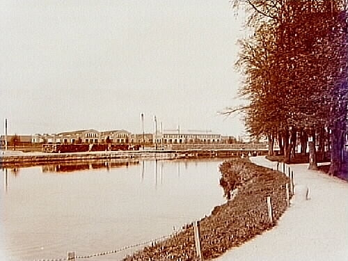 Utsikt mot Central Verkstäderna (CV), Alnängarna, från Stora Holmen. Fabriksbyggnader.