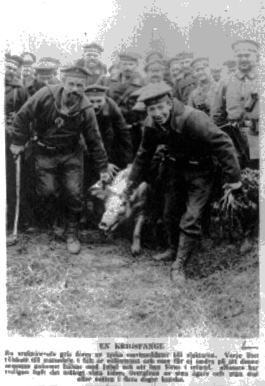 Krigsbild, tyska marinsoldater med en tillfångatagen gris på väg till slaktaren.