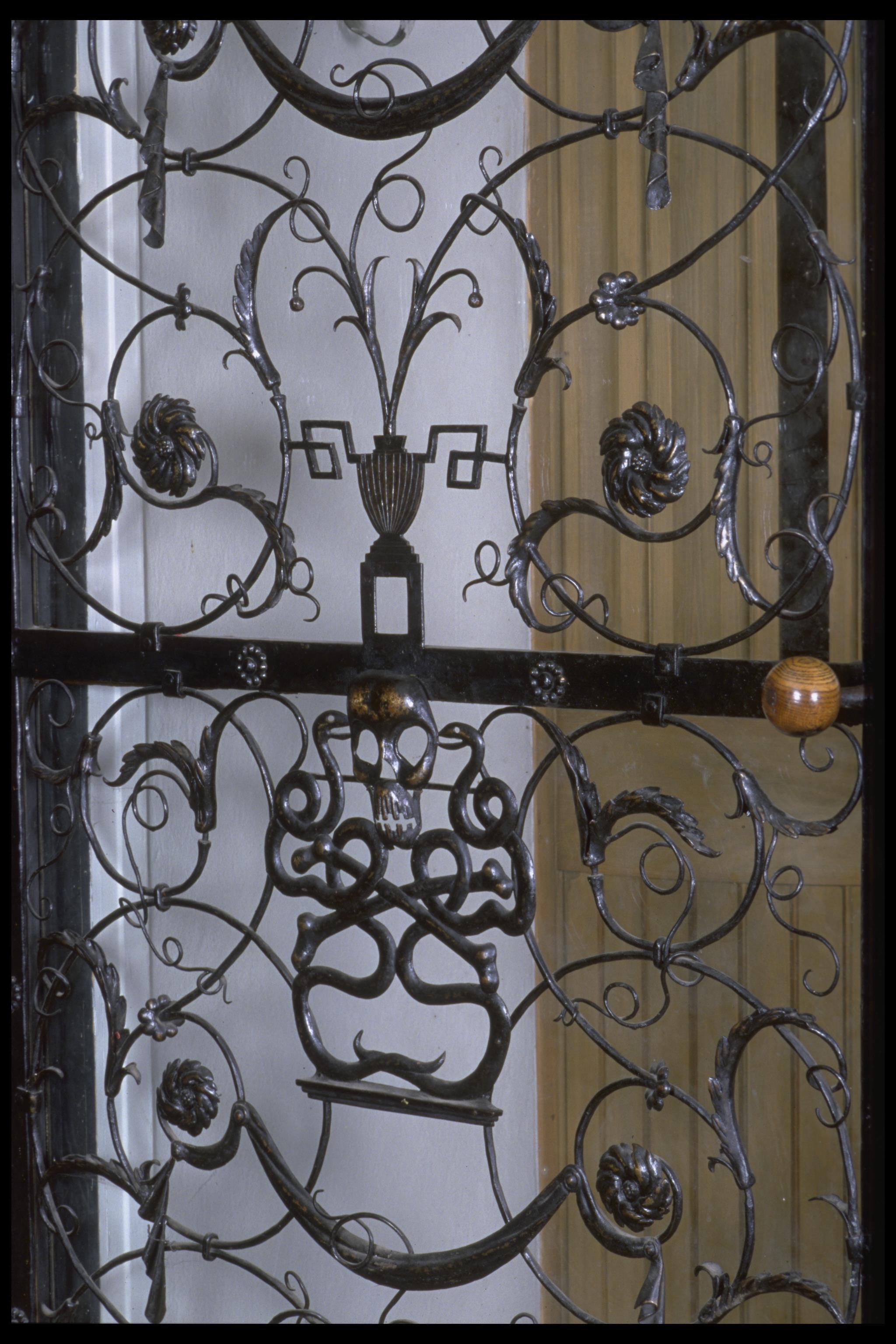 Beskrivning: Skogskapellet, interiör, dörrgrind av järnsmide.