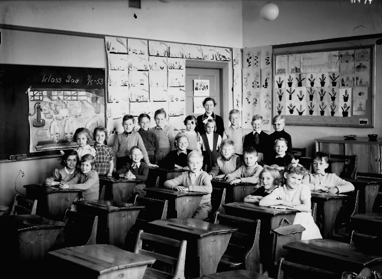 Engelbrektsskolan, klassrumsinteriör, 21 skolbarn med lärarinna fru Britta Månsson.