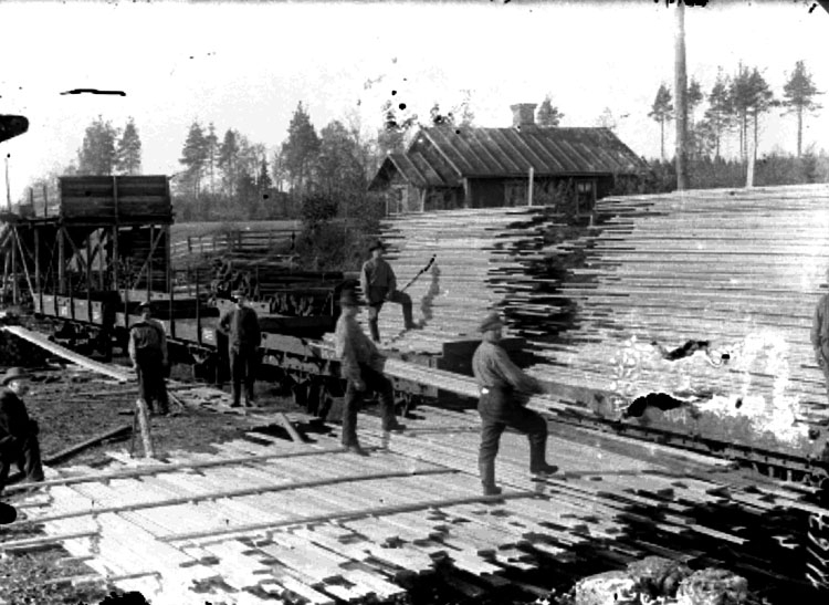 Sågverk, lastning av trävirke i tågvagnar, sex arbetare.