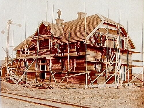 Kvismaren Järnvägsstation under byggnad, 13 byggnadsarbetare.