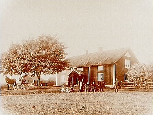 En och en halvvånings bostadshus med förstebro i snickarglädje, ekonomibyggnader. Häst spänd för trilla. Grupp, 10 personer framför huset.