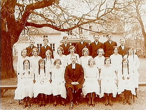 Konfirmander, 15 flickor, 7 pojkar och kyrkoherde Gabriel Carlsten.