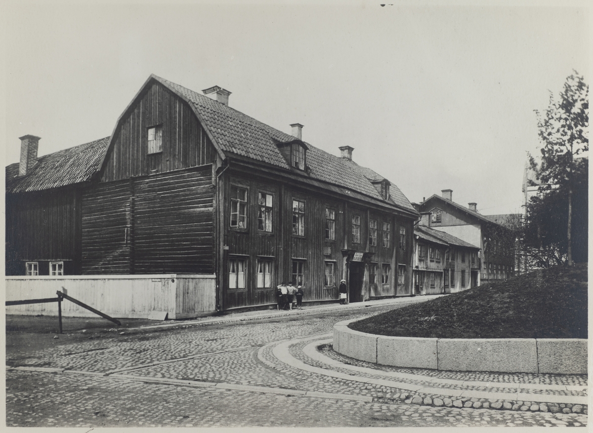 Kyrkogatan norrut från Nikolaigatan. Tvåvånings bostadshus, Lindhska boktryckeriet. Borgarstugan och krogen Vasakällaren. Reproduktion efter en bild tagen omkring 1900.