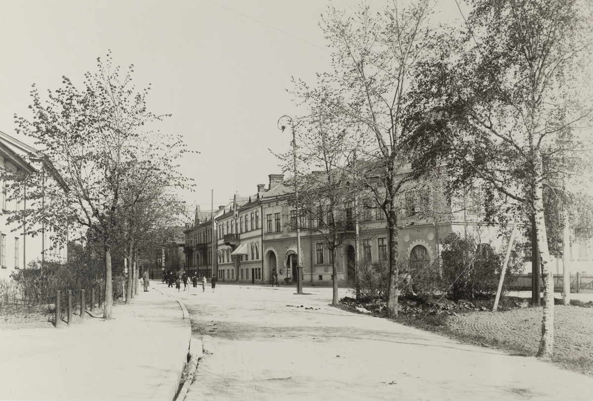 Engelbrektsgatan västerut, till höger hörnhuset Engelbrektsgatan 23 / Floragatan, till höger går Sturegatan.