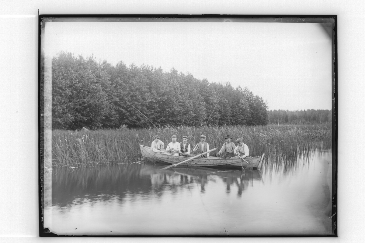 Sjötorp. Sex stenhuggare i en båt.