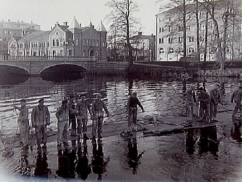 Kabelnedläggning i Svartån mellan Vasastrand och Södra Strandgatan, arbetare på spång. Vasakyrkan.