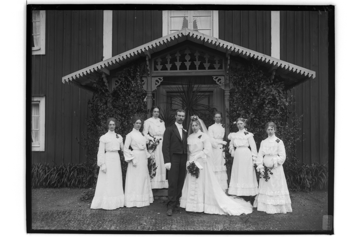 Bröllop. Brudpar och sex tärnor. Bruden helt i vitt, med slöja. Brudgummen i frack.