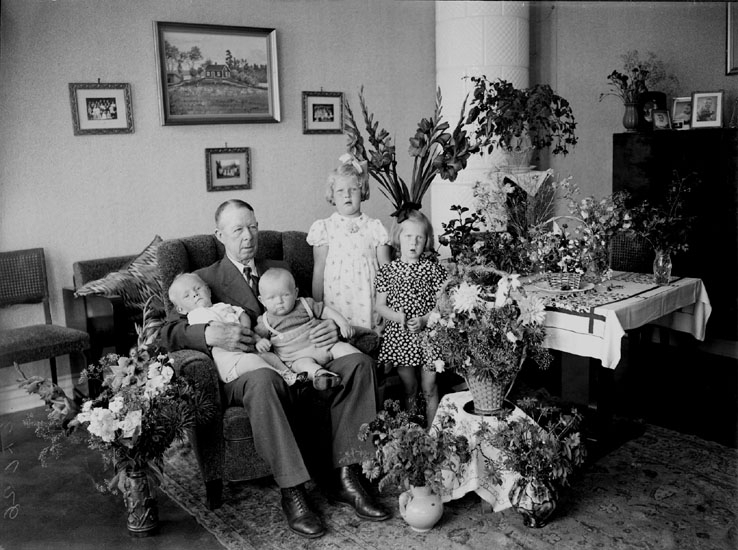 Rumsinteriör, en man och fyra småbarn.