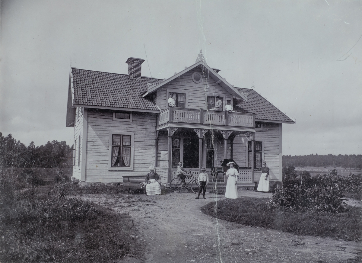Bostadshus, grupp framför huset.