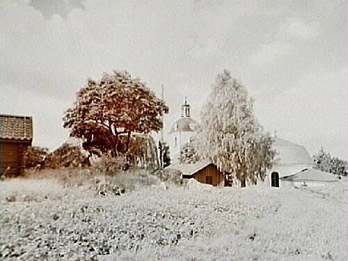 Ramsbergs kyrka från prästgårdstrappan och jättestenarna.