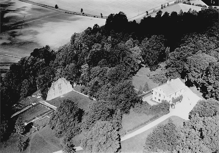 Flygfoto över Riseberga klosterruin och Riseberga Herrgård.