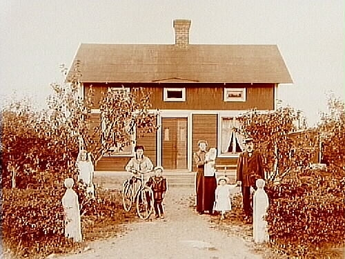 Föräldrarna Erik och Augusta Granberg och barnen: pappan Erik håller Elsa i handen, mamman Augusta med Karin, Ivan håller i cykeln med Elmer vid hjulet och Ina vid busken.