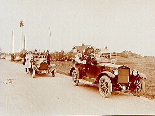 Bröllop. Brudpar och bröllopsgäster som passagerare.
