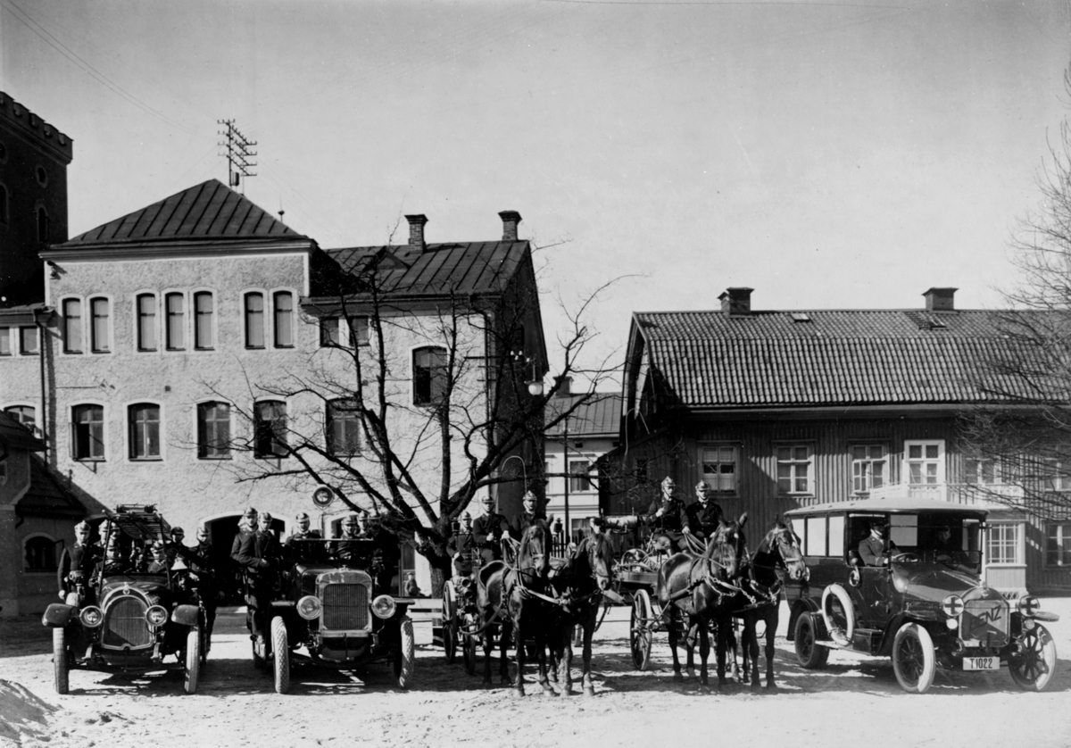 Örebro Brandstation, brandbilar och brandmän, hästar och vagnar.