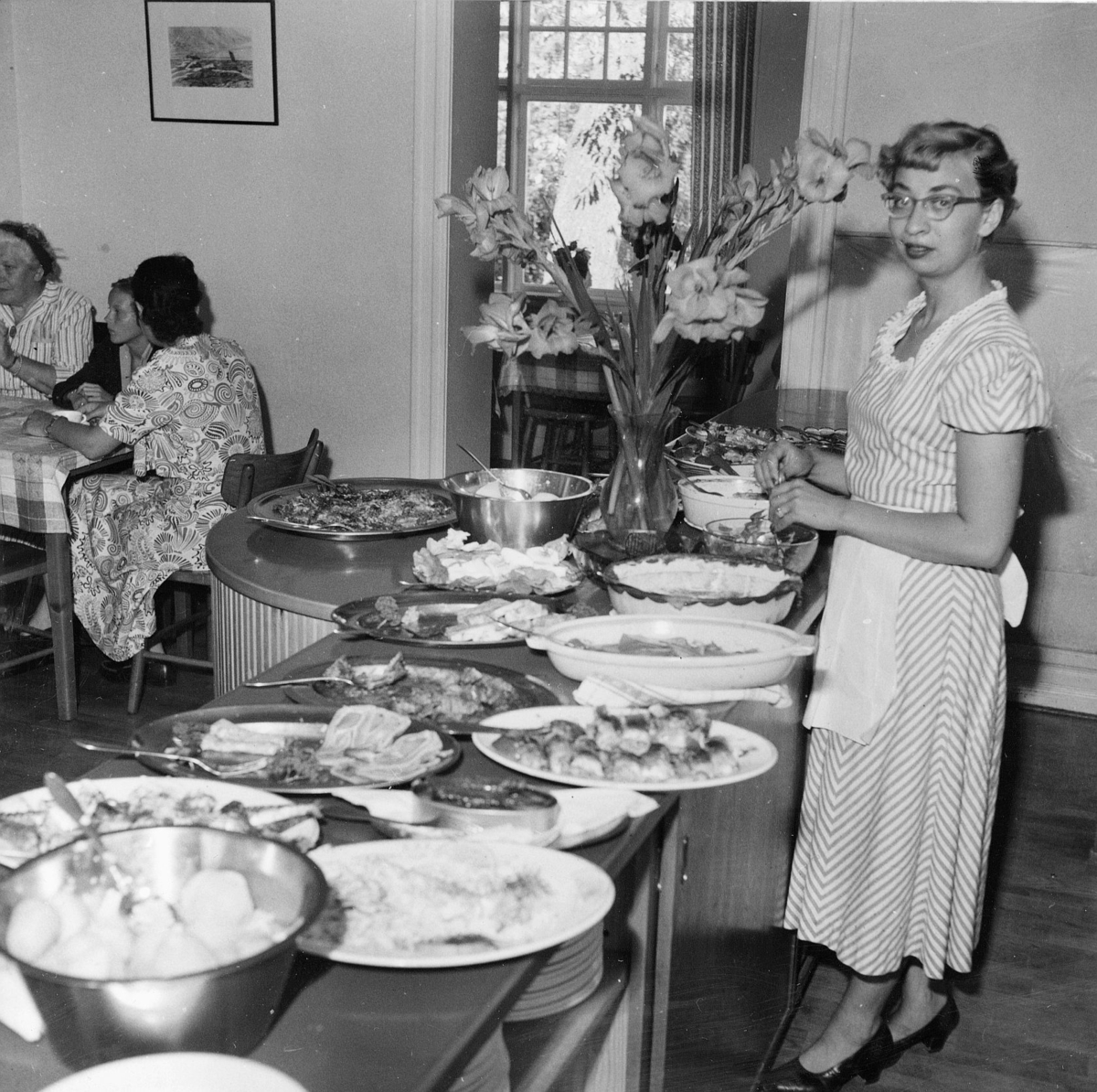 4-5/1953). Fröken Yrsa Nilsson dukar lunchbord i matsalen Solhäll, en bits promenad från Norregård.