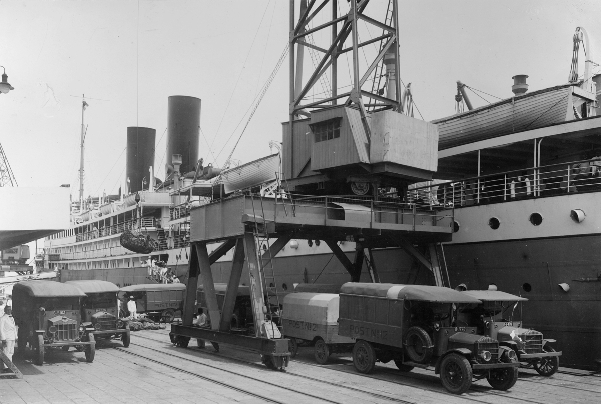 Posten från Europa lossas i hamnen i Tanjung Priok, Jakarta, Indonesien.